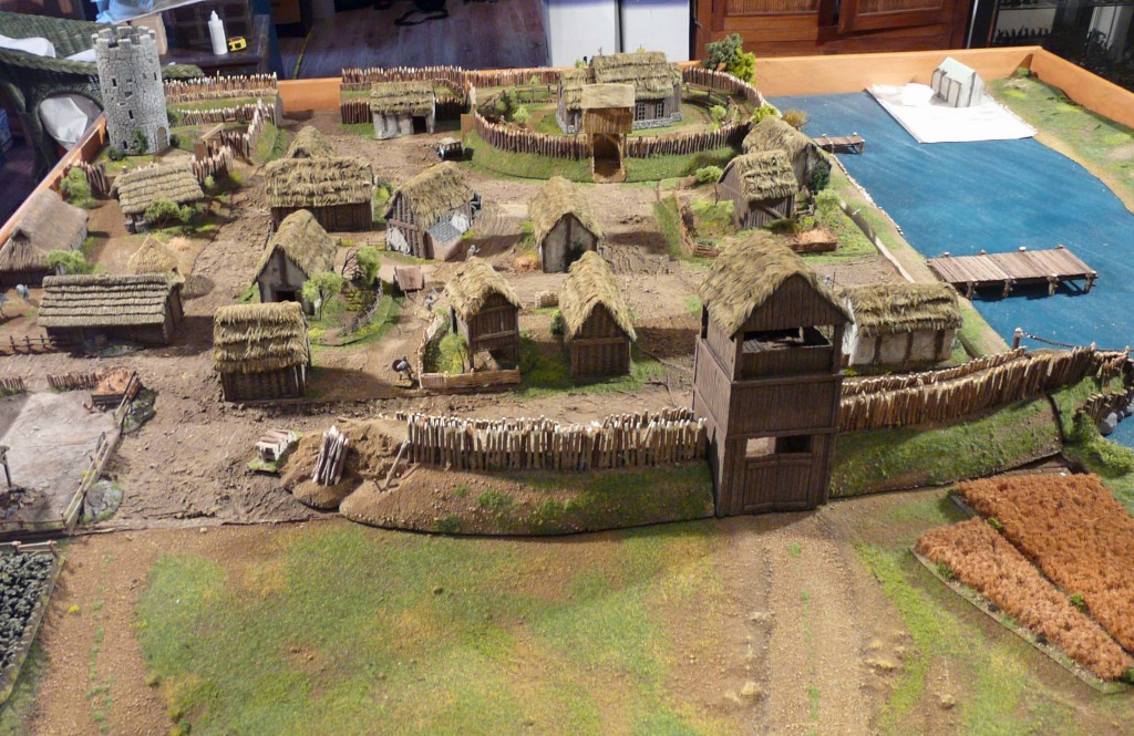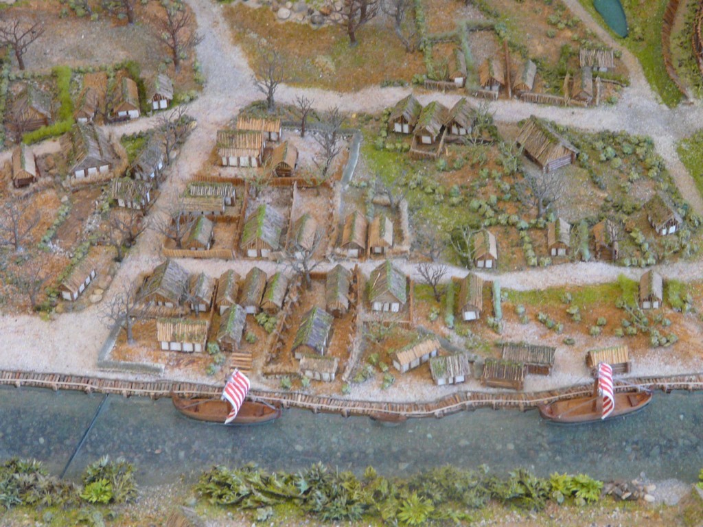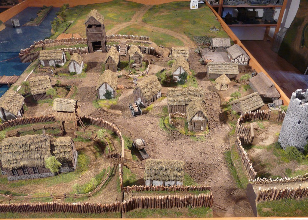Ein paar verstreute Hütten und Felder. Ziemlich unspektakulär. Das ganze sieht aus, als wisse man noch nicht so ganz genau, ob die Steinzeit in Norddeutschland zu diesem Zeitpunkt wirklich schon vorbei war. Daher haben wir uns entschlossen, for the sake of Drama, von der Historie abzuweichen und für unsere Präsentation einige Elemente darzustellen, die es eigentlich erst 200 Jahre später gegeben hat. Auch hierfür hat das Museum für Hamburgische Geschichte ein sehr schönes Diorama parat.