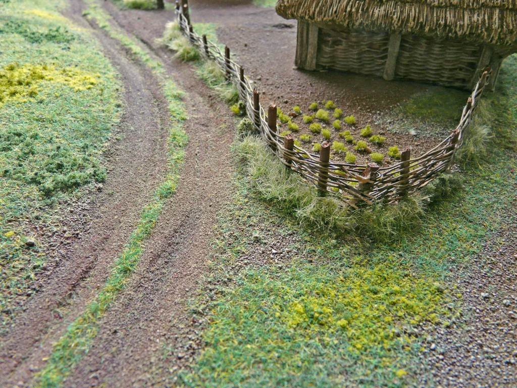 Eine Nahaufnahme der Bodengestaltung und der Weidengeflechtzäune. In der Mitte hinten die Methode mit Draht, vorne links ist der Zaun aus Schnur gebaut. In dieser Ansicht gefällt mir der Draht besser, da viel realistischer. Mit der Schnur läßt sich der Zaun besser bauen und sieht hinterher „ordentlicher“ aus, was auf größere Entfernung besser wirkt.