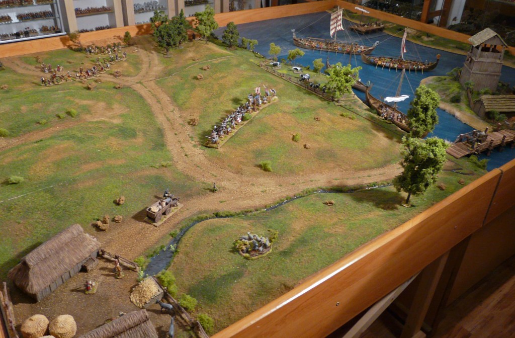 Moin zusammen, es ist Zeit, das neue Bauprojekt für die Tactica 2012 zu beginnen. In vielen Gesprächen und Mails hat sich bei Patrick (Wraith) von den Kurpfälzern, Thomas Hahn aus Hessen und mir Nordlicht eine gemeinsame Liebe zum „dunklen“ Frühmittelalter gezeigt. So haben wir beschlossen, ein gemeinsames Projekt für die Tactica 2012 anzugehen: Den Wikingerüberfall auf die Hammaburg im Jahre 845. Patrick (Wraith) wird für den Großteil der Figuren und die gespielten Szenarien verantwortlich sein. Thomas Hahn baut die Gebäude und die Ringwallsiedlung des frühmittelalterlichen Hammaburg. Ich werde den Plattenbau, die Landschaftsgestaltung und die historische Recherche übernehmen und ein paar Wikingerschiffchen beisteuern. Da wir nun zu dritt sind, darf es auch ein wenig größer werden. In Planung ist eine Präsentation von 3 x 3 Metern, allerdings in einer L-Form, um sicherzustellen, daß man auch noch überall dran kommt. Heute stelle ich die Ergebnisse der Recherche vor. Das Museum für Hamburgische Geschichte war da ein Quell der Inspiration und hat auch sehr schöne Dioramen zu dem Thema. Der Wikingerüberfall auf die Hammaburg Hamburg (damals noch Hammaburg) war ursprünglich eine sächsische Siedlung. 804 ließ Karl der Große, in seiner unnachahmlichen Art, die Segnungen des Christentums zu den Heiden zu bringen, die Sachsen deportieren und siedelte slawische Abodriten in der verlassenen Siedlung an. 817 wurden die Abodriten aber von den Franken bereits wieder vertrieben, nachdem sie mit dem dänischen König paktiert hatten. Bischof Ansgar erhielt Hamburg 831 als seinen Sitz und Missionsstützpunkt. Die Bevölkerung Hamburgs wird zu diesem Zeitpunkt auf nicht mehr als 200 Bewohner geschätzt. Ein Kaff am Arsch der Heide also. Immerhin aber groß genug, dass die dänischen Wikinger es 845 überfielen und niederbrannten. Bischof Ansgar, die feige Sau, machte sich aus dem Staub und floh nach Süden. Er kehrte nie wieder zurück und das Projekt, Hamburg als eigene bischöfliche Diözese aufzubauen, war gescheitert. Das hier ist ein Modell von Hamburg zur Zeit Ansgars aus dem Museum für Hamburgische Geschichte: